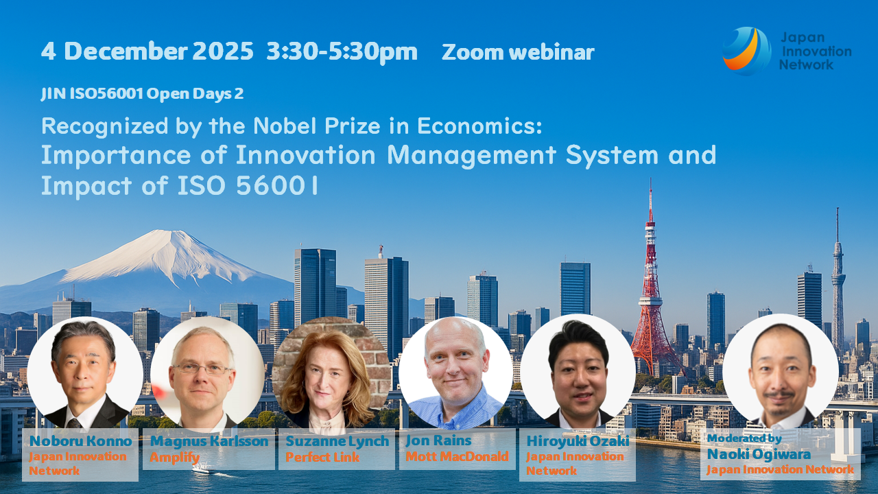 News Event Event Event Nov 03, 2025 Recognized by the Nobel Prize in Economics: Importance of Innovatio... JIN ISO 56001 Open Days 2: Latest Insights on the Innovation Management System Join us for the second day of J […] Event Oct 07, 2025 Japan Innovation Network presents ISPIM CONNECTS YOKOHAMA Panel Dis... Japan Innovation Network (JIN) is once again partnering with ISPIM (The International Society for Professional […] Event Nov 27, 2024 “EICN Tokyo - Annual Conference” On 21 November, the ‘2024 EICN Tokyo Annual Conference’ hosted by The Economist’s Economist Intelligence Corpo […] Event Nov 06, 2024 December 2: IMS SUMMIT 2024 in Osaka with online streaming Japan Innovation Network (JIN) has been hosting the annual IMS SUMMIT since 2019 with the aim to accelerate sy […] Event Jul 21, 2020 JIN is recruiting enterpreneurs to compete in the Entrepreneurship ... Global Entrepreneurship Network (GEN), a global startup network and Japan Innovation Network (JIN) will host t […] Event Jul 21, 2016 SDGs (Sustainable Development Goals) to Business Opportunities SDG... Emerging issues such as the rise of digital culture, climate change, and the environment are dramatically chan […] 1